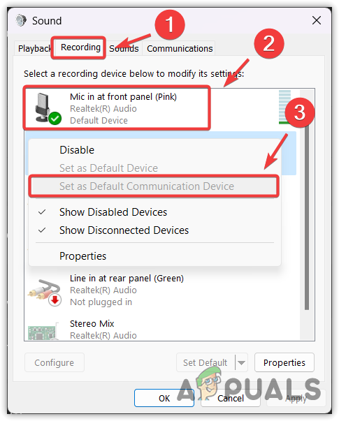 - Navigate to the Recording tab, right-click on the microphone, and also set it as the default communication device.
