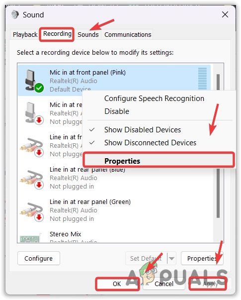 - Proceed to Recordings, right-click the Microphone, and visit Properties.