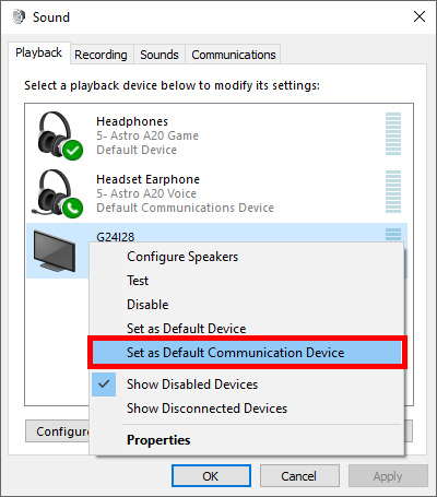 - Right-click on your headset and select Set as Default Communication Device.
