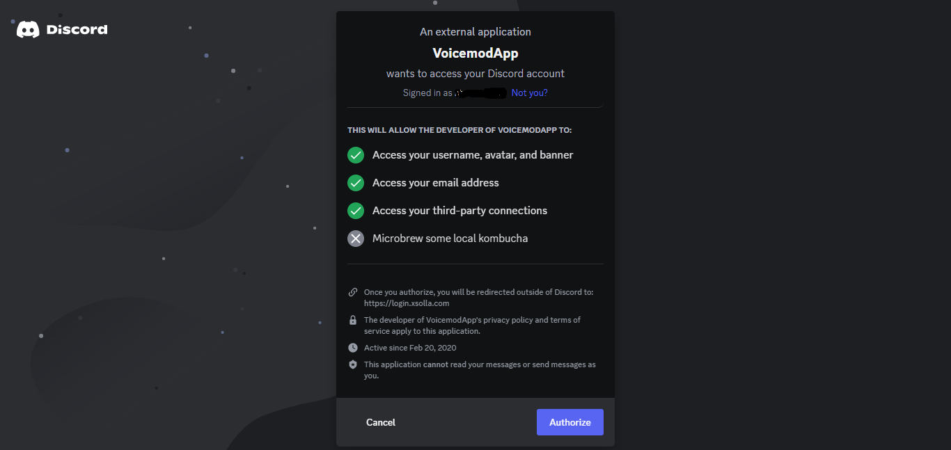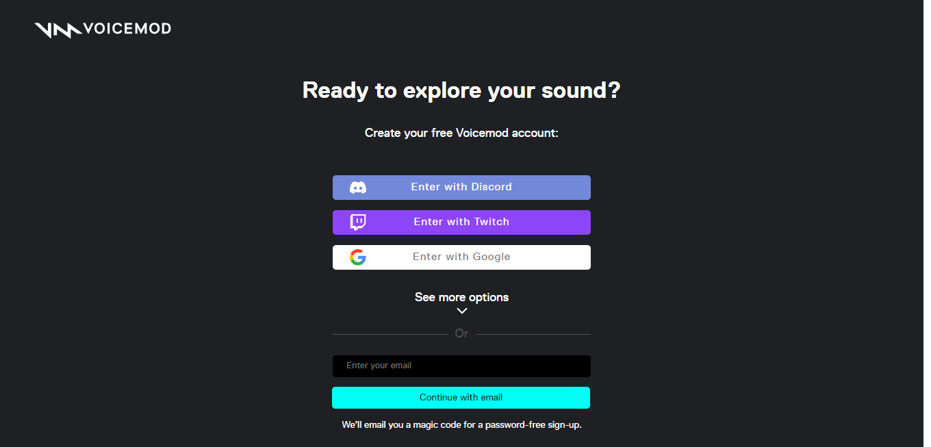 Click the big blue button on this homepage - On the new page that opens, enter your Discord credentials by clicking on Enter with Discord while making your free Voicemod account.