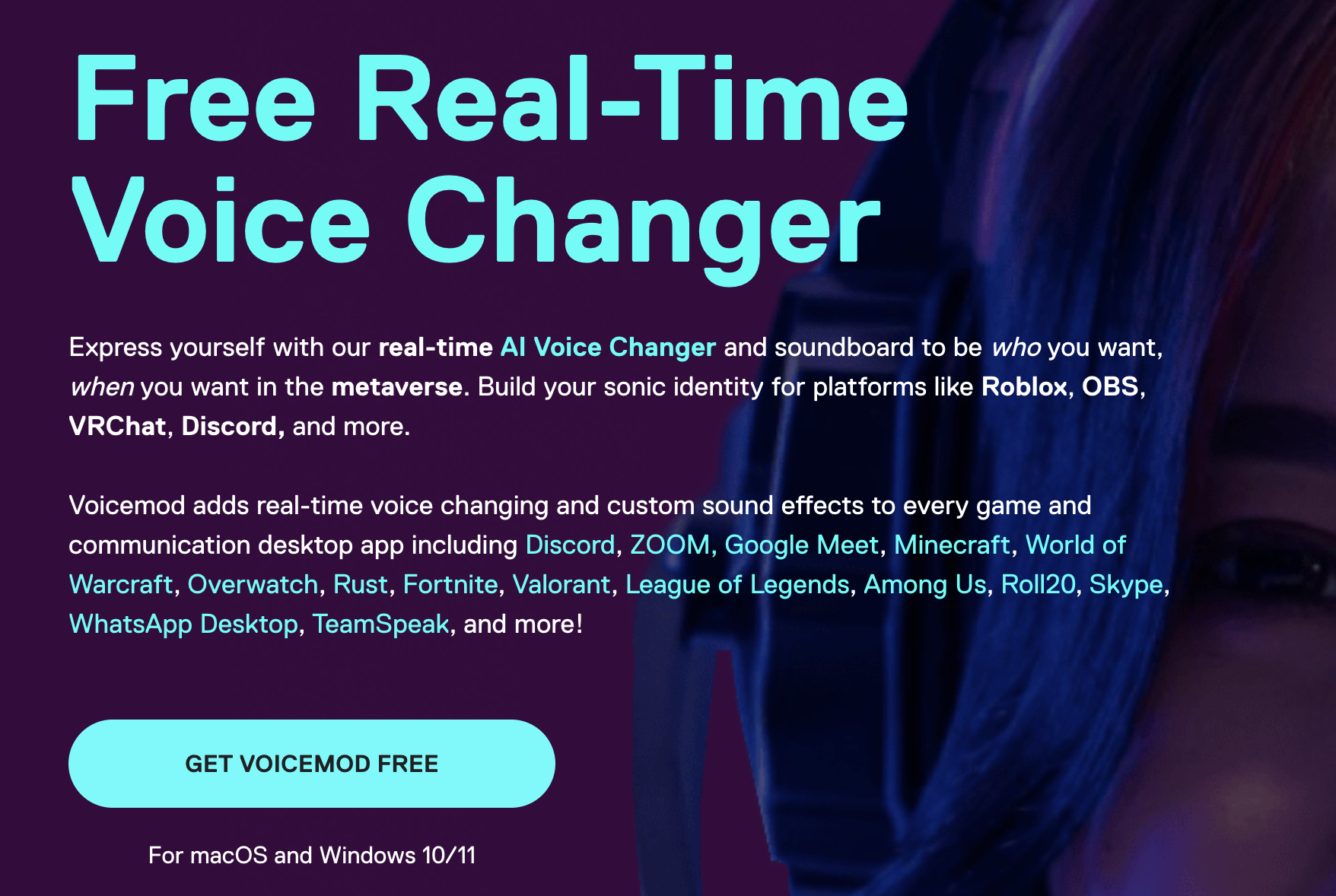 - Start by visiting the Voicemod website and clicking the blue GET VOICEMOD FREE option. Make sure you have Windows 10/11 64-bit version.