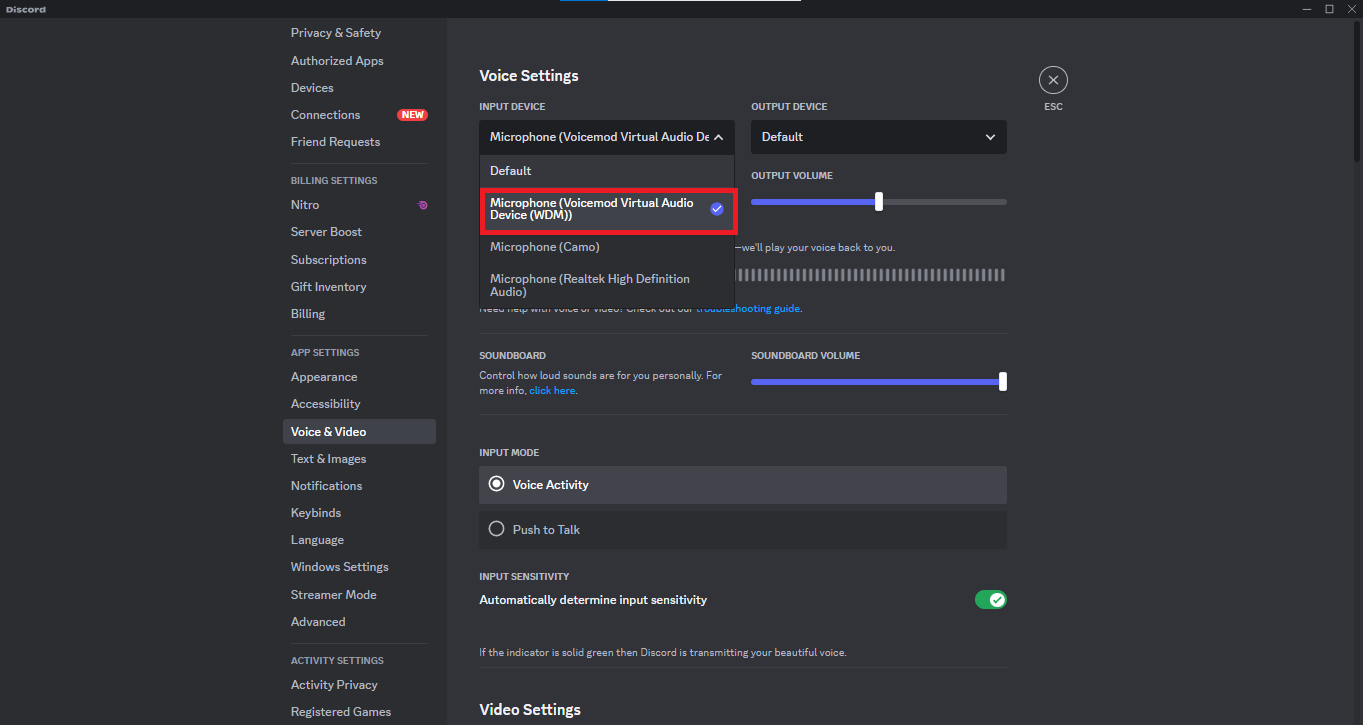 - Click on the drop-down Input Device and select Voicemod Virtual Audio Device.