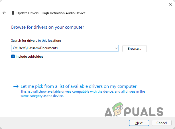 Browsing PC for Driver - On the follow up screen, click the Let me pick from a list of available drivers on my computer option.