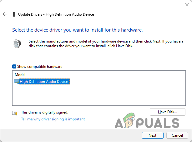 Choosing Audio Driver - Choose the High Definition Audio Device option and then click the Next button.