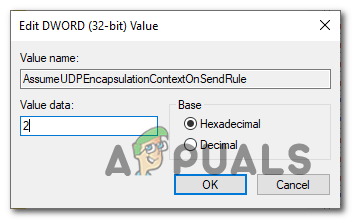 Creating the new dword value named AssumeUDPEncapsulationContextOnSendRule - Once the value has been successfully created, double-click on it, then set the Base to Hexadecimal and the Value data to 2.