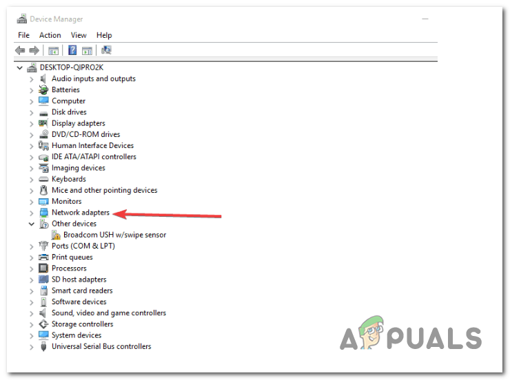 Typing “devmgmt.msc” in the run prompt. - Once you’re inside Device Manager, scroll down through the list of devices and expand the drop-down menu associated with Network Adapters. Next, right-click on your network adapter and choose Uninstall from the context menu.