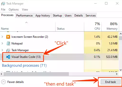 Sometimes, background processes from previous sessions continue to run even after you close the window. Force-closing these processes ensures VS Code restarts fresh.