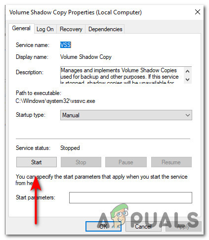 Volume Shadow Copy Service Windows - Now check the Service status. If the service is stopped, click on the Start button. If it is already running, then hit the Stop button and then click on Start to restart it.