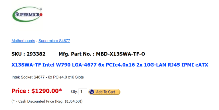 Currently, the price tag of 1290 Canadian Dollars clearly identifies the W790 as a server-class motherboard. This board features 6x PCIe Gen 4 slots, 2x 10Gbit LAN ports with the E-ATX form factor. It is clear that Intel is aiming big with Fishhawk Falls.