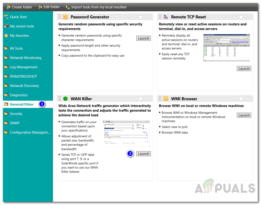 - Once the launch pad has opened up, you will have to look for the WAN Killer tool. This can be done via two methods. First, you just search for WAN Killer in the search field provided and then click the Launch button. Secondly, you can go to General/Other on the left-hand side and then click the Launch button for the WAN Killer tool.