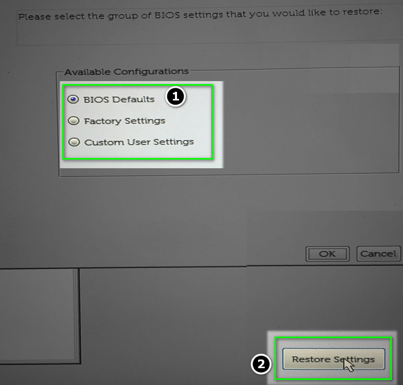 - Boot the PC into the BIOS and click on Restore Settings (near the right bottom of the screen).