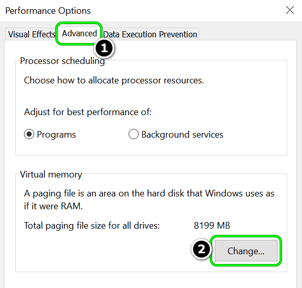 Open Performance Settings in Advanced System Settings - Then, click on Change in the Virtual Memory section and uncheck Automatically Manage Paging File Size for All Drives.