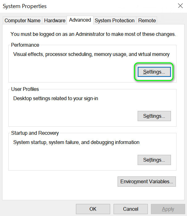 Open Advanced System Settings - Now open Settings (in the Performance section) and head to the Advanced tab.