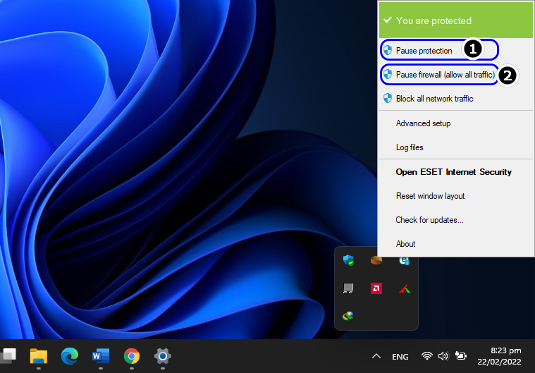 Pause ESET Protection and Firewall - Now select Pause Projection and if a UAC prompt is shown, click on Yes.