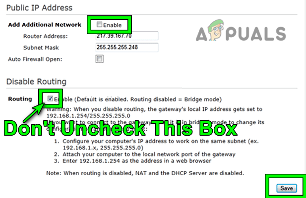 Open Link Configuration Tab in the Router’s Web Portal - Then steer to the Link Configuration tab and in the Public IP Address section, uncheck Enable for Add Additional Network. Do not uncheck Enable for Routing, otherwise, the router may stop working.