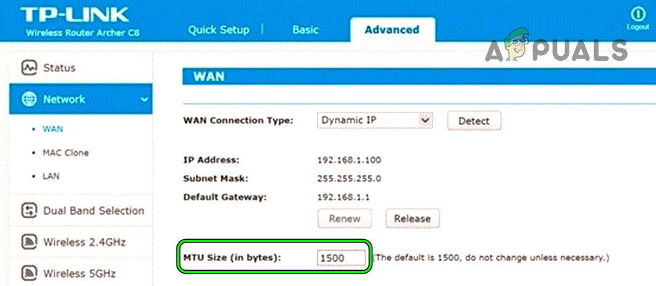 - Now, open Advanced>> Setup>> WAN Setup and set the MTU value to 1372.