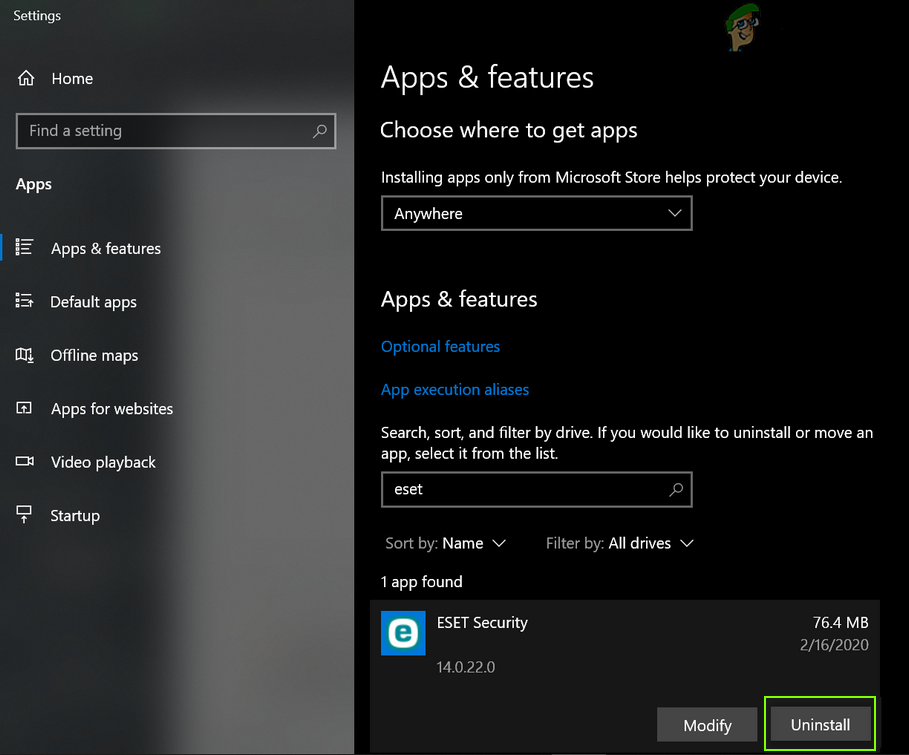 Open Apps & Features - Now expand the security product (like ESET) and click on Uninstall.