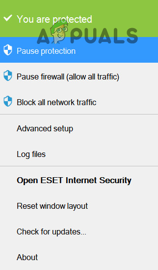 Pause Protection of ESET Internet Security - Then confirm to disable the real-time protection and again, right-click on the security product (e.g., ESET) in the system’s tray.