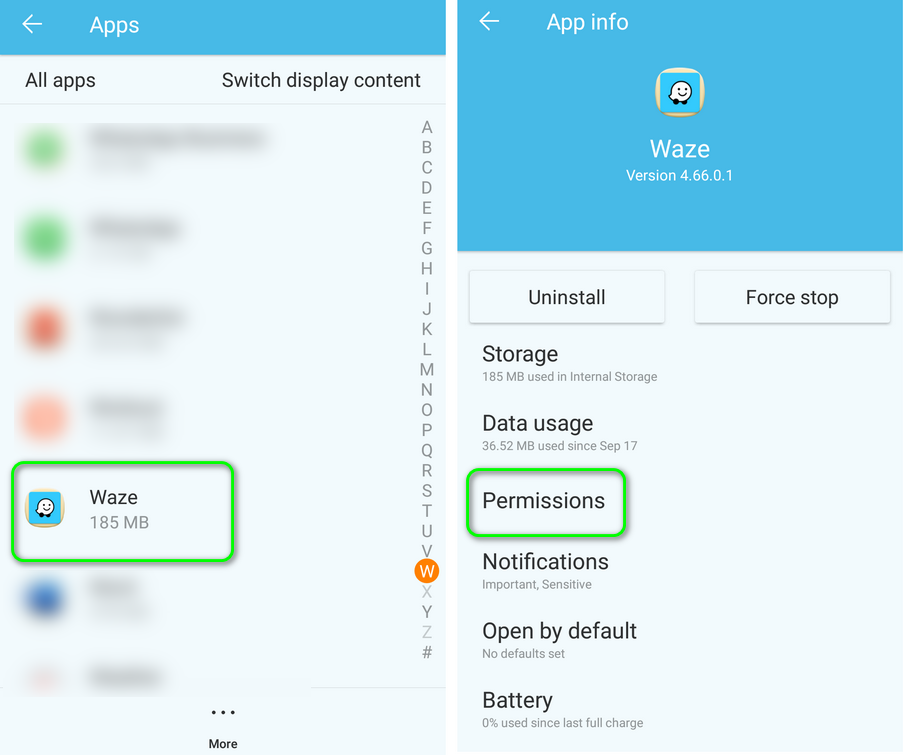 Open Permissions Settings for Waze - Make sure all the permissions required by Waze are enabled.