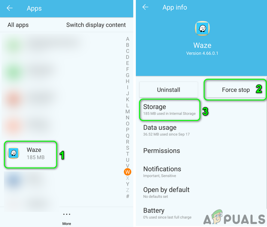 Clear Cache and Data of Waze - Then confirm to clear the data (you may check at this step if the issue is resolved, if not, then repeat steps 1 to 5).