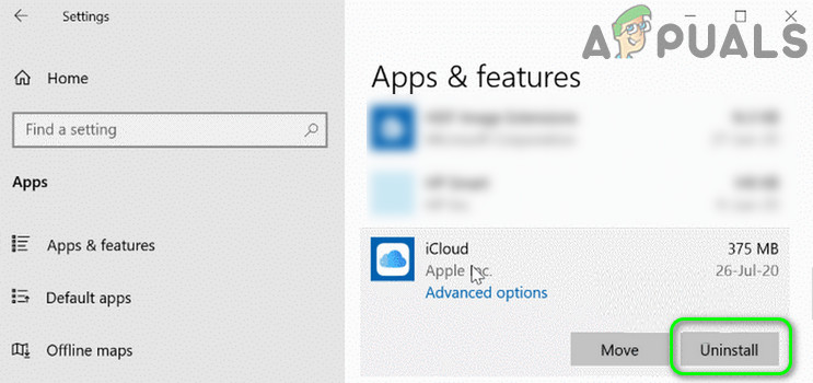Uninstall the iCloud from Windows Settings - Follow the prompts to complete the uninstallation of iCloud, then reboot your PC.