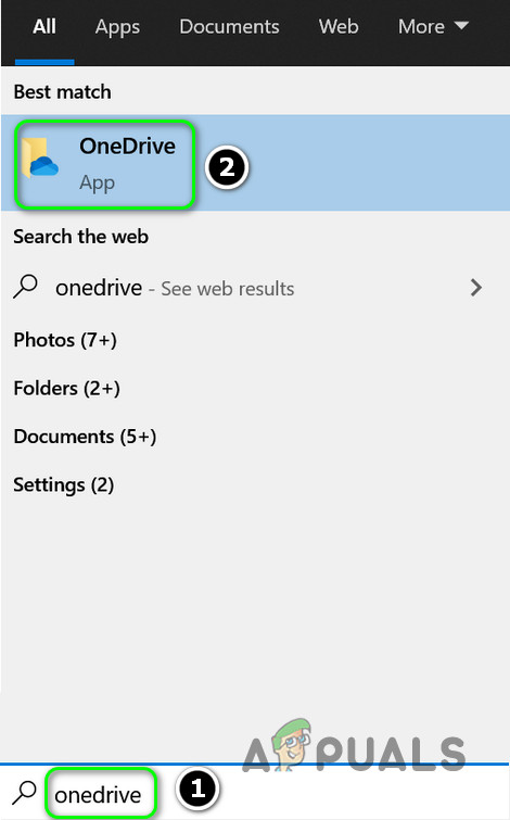 Close OneDrive from the System’s Tray - Click on the Windows button and type OneDrive in the search bar. In the results shown, choose OneDrive.