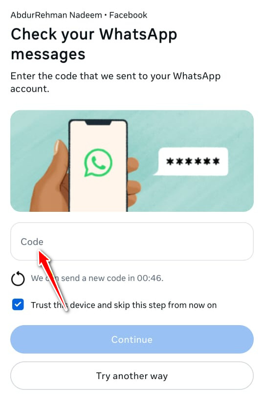 - Enter the code sent to your WhatsApp, and your account will log in successfully.