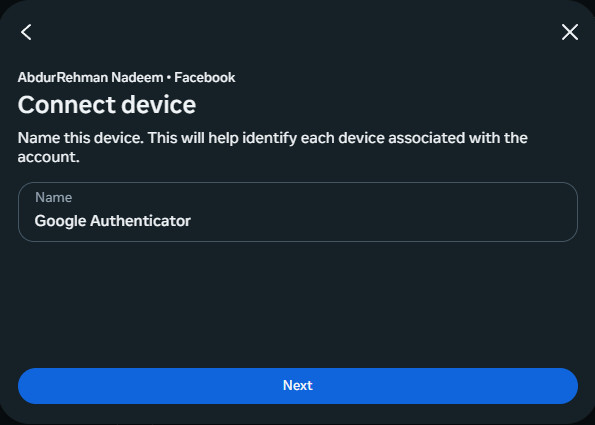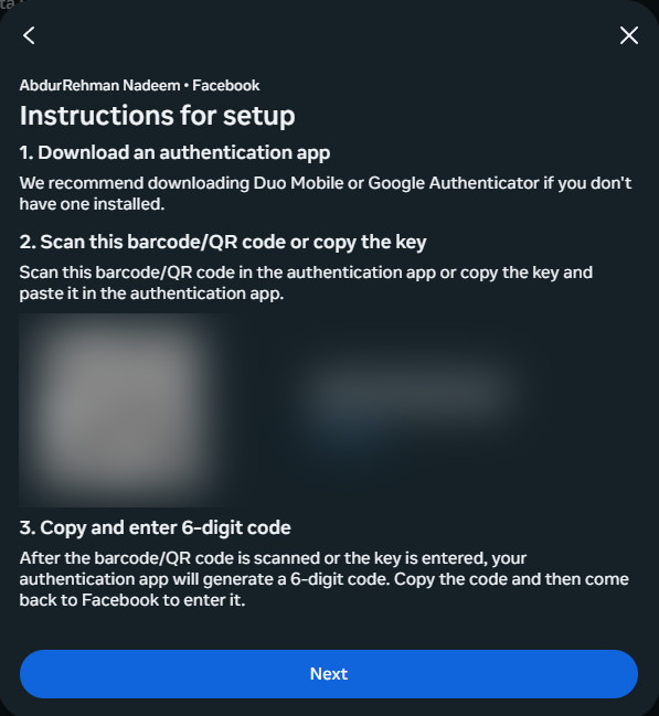 - Once scanned, select Next and enter the current code in your authenticator.