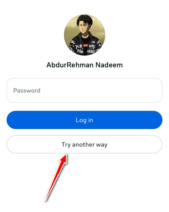 - Facebook will display the account linked to the email you entered. Instead of entering your password, select Try another way.