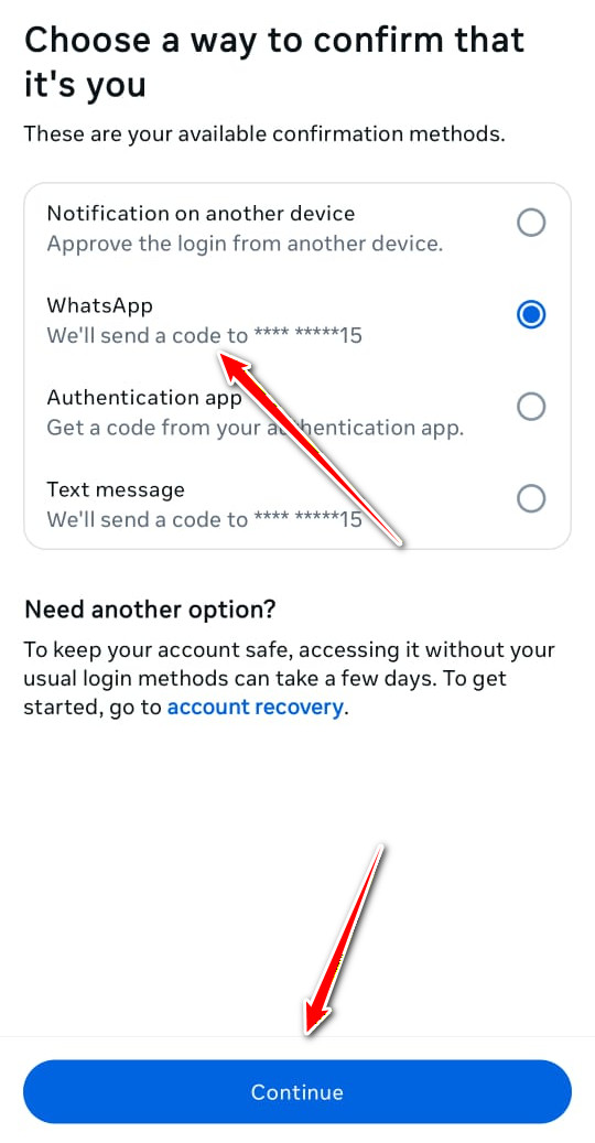 - On the next page, select WhatsApp instead of Text message and tap on Continue.