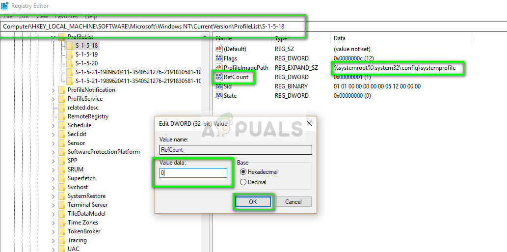 - Once you have expanded the folder, you will find several subfolders inside. Click the folder which has ProfileImagePath key pointing towards the system profile path. Once you have selected the folder, double-click on RefCount and change the value from 1 to 0. (Important point: if the said values are already there, then switch the value to any other value and then to the above-said values)