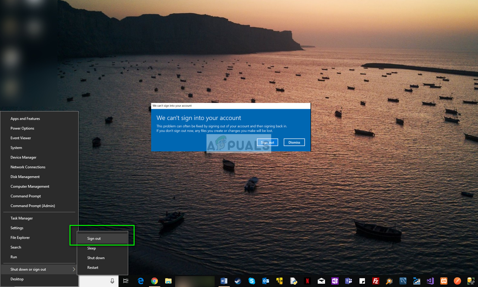 - Right-click on the Windows icon present at the bottom-left side of your Desktop and select Shut down or sign out > Sign out.