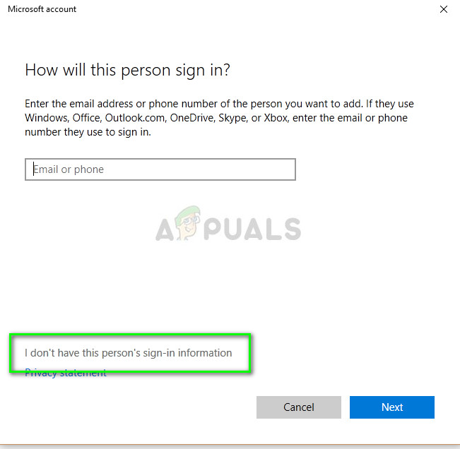 Add Someone Else to This PC - Now Windows will guide you through its wizard on how to create a new account. When the new window comes forth, click “I don’t have this person’s sign-in information”.
