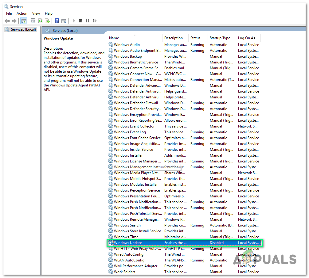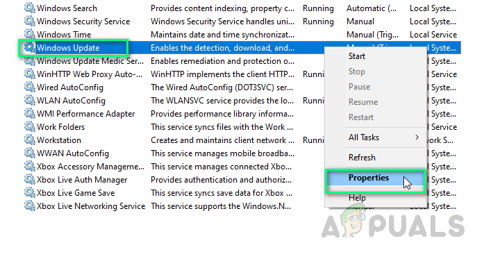 Users have reported online that restarting Windows Update Services helped them fix this problem as restarting Windows Update Services will undo any undesired configuration being done to the system by the user or some application. Therefore, go through the following steps to restart Windows Update Services: