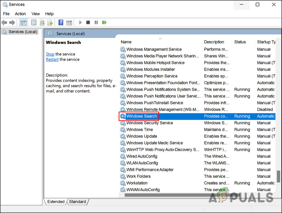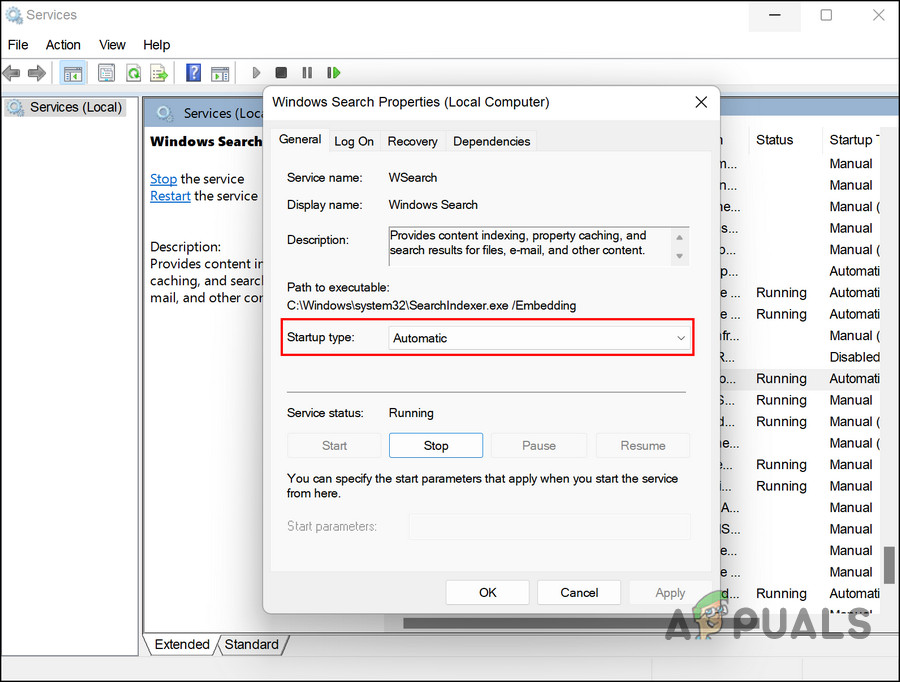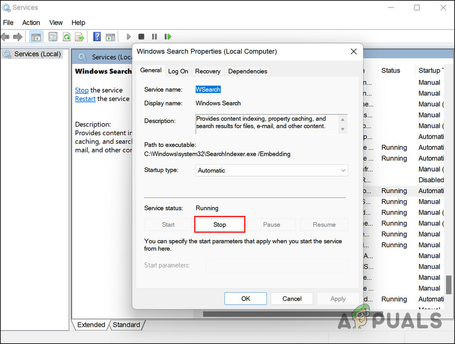 Access the Windows Search service - In the dialog, click on the Stop button, wait for a few minutes and then click Start.