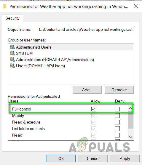 If you are work in a multi-user environment, where you have more than one user set up on your PC then this method might work for you. When there is more than one user then each of them has a separate set of permissions and when one user installs an application, others might not have access to it by default. So if the Weather Application was installed by another user you might first have to grant yourself full access to it. Please see the steps below: