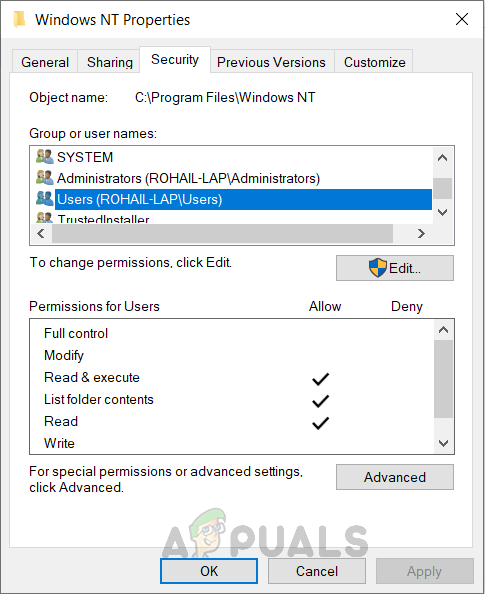 Change User permissions - In the new dialog box check the box that says Full Control and click Ok to apply changes