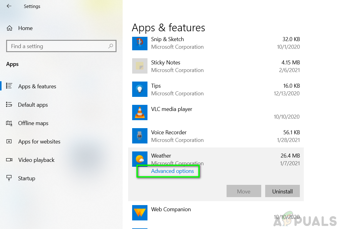Click on Apps in Windows Settings - Search for the Weather app and click on it and then click the Advanced Options.