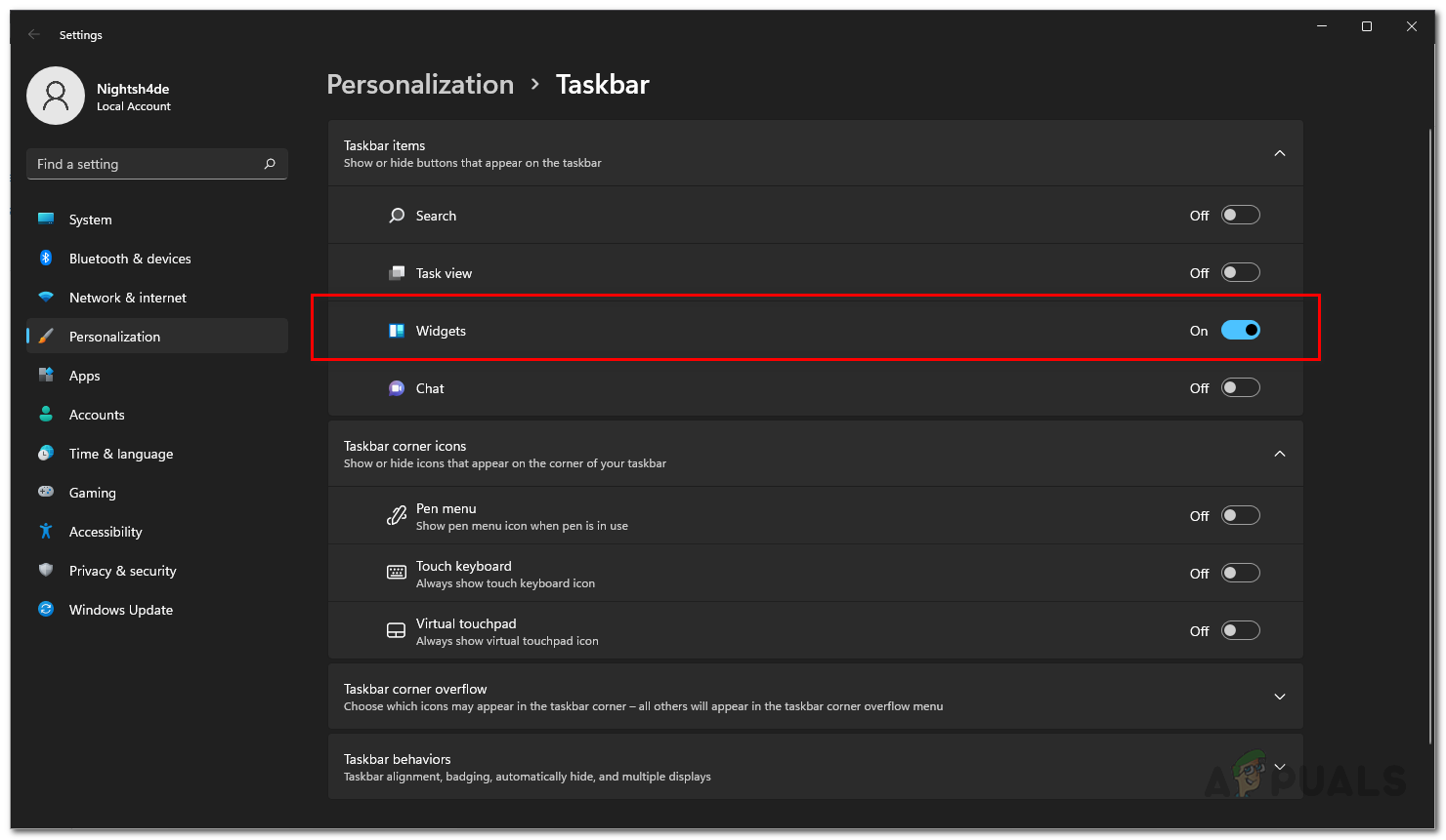 Accessing the Taskbar menu - In the taskbar window, look for the Widgets option and make sure that the toggle associated with it is enabled.