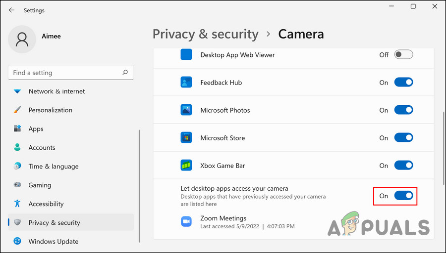 - In case you cannot locate the app, turn the toggle on for Let desktop apps access your camera.