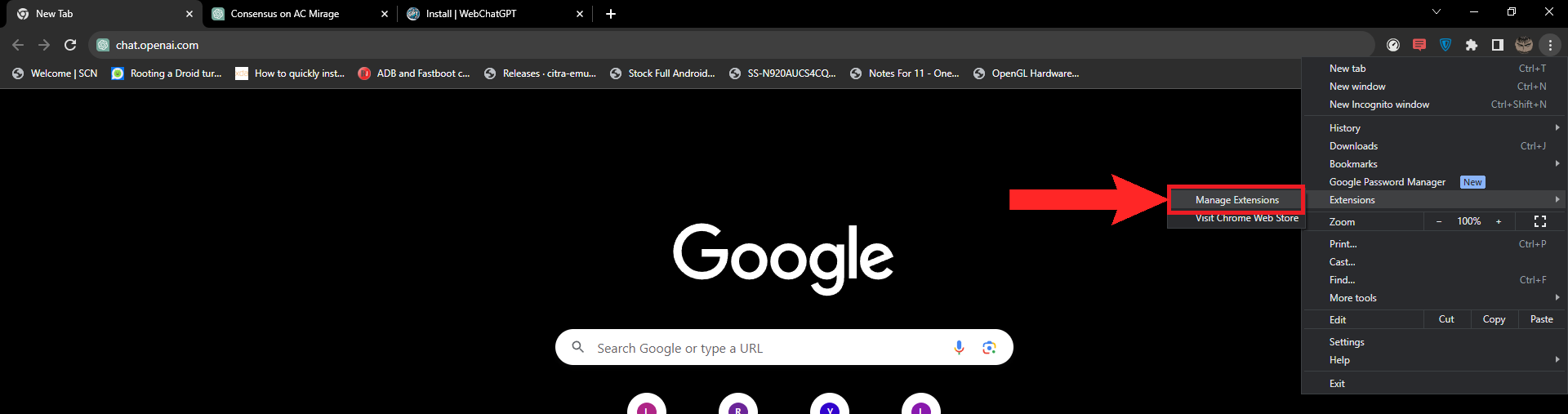 Hover your cursor on “Extensions” - Consequently, another drop-down menu will open up. Select Manage extensions.