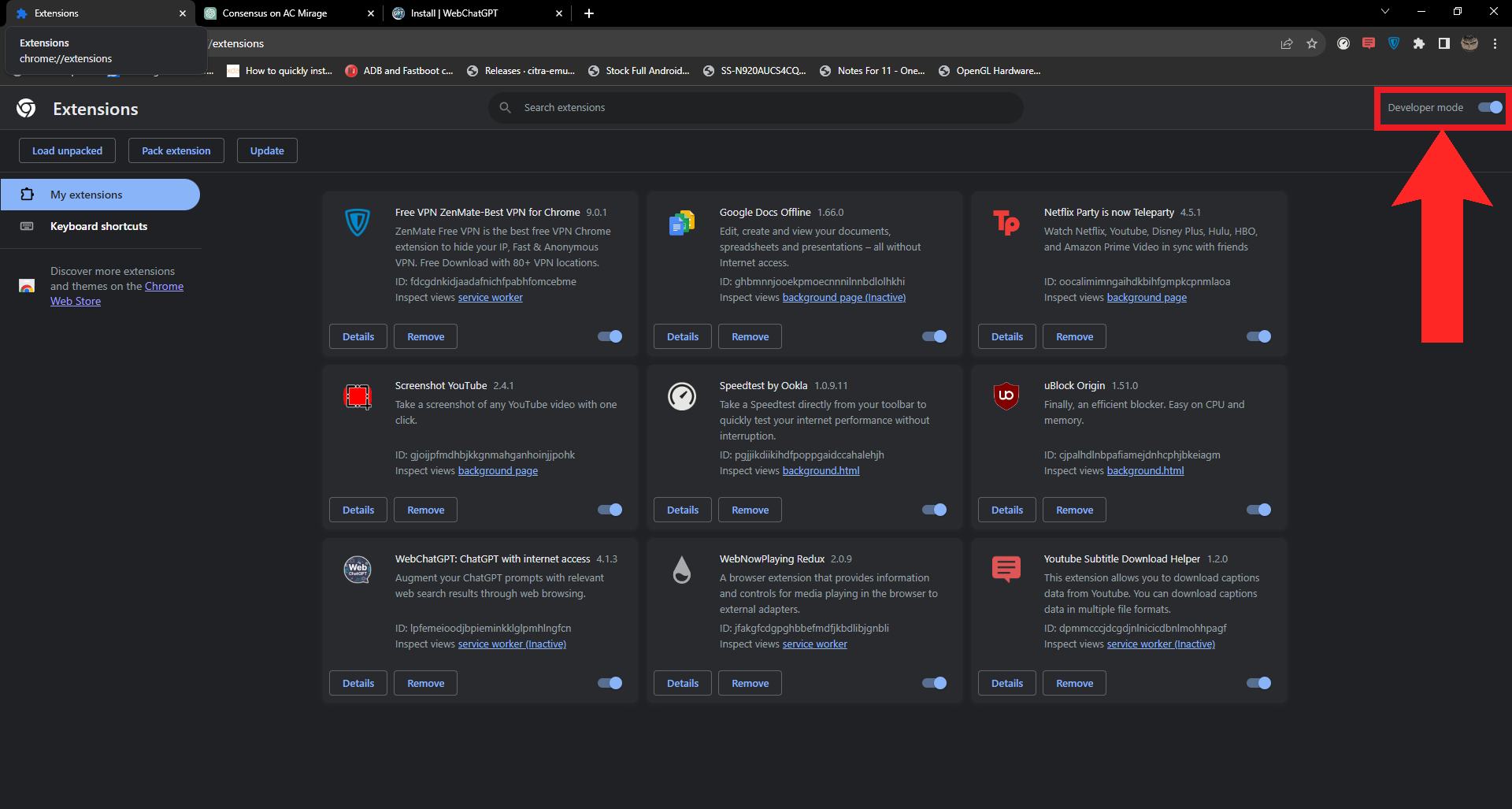 Click on “Manage Extensions” - On the Extensions tab, look to the top-right and switch on Developer Mode.