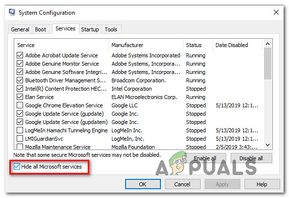 - Inside the Services screen, start by checking the box associated with Hide all Microsoft Services. This steps will exclude all Windows services ensuring that you don’t end up disabling a service that is actively used by your OS.