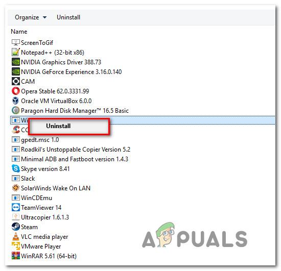 Type appwiz.cpl and Press Enter to Open Installed Programs List - Once you manage to get inside the Programs and Features screen, scroll down to the list of applications and locate your Wondershare product(s). Once you see it, right-click on it and choose Uninstall from the newly appeared context menu.