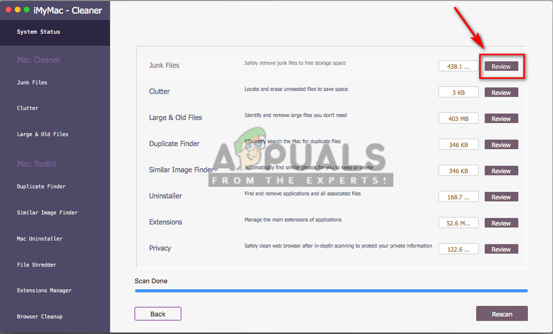 iMyMac Scanning System - After the scan is done, click Review option next to the Junk Files