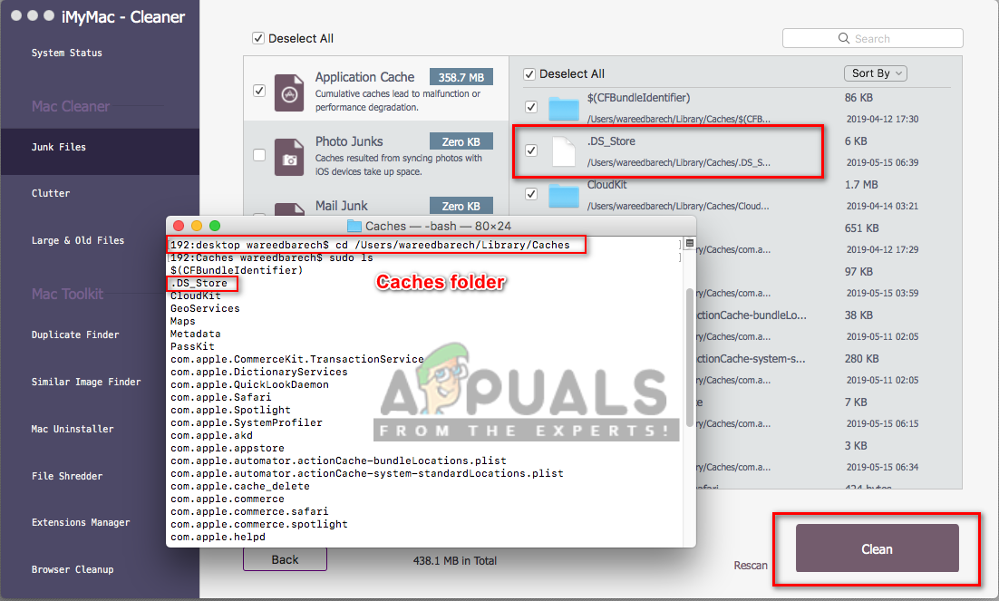 Reviewing the files found after Scan - You can locate the .DS_Store file and click on Clean button. But sometimes there are .DS_Store files inside the cache folders or others as shown below in Terminal: