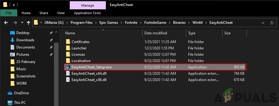 However, you can always manually uninstall Easy Anti-Cheat by using the Easy Anti-Cheat Service Setup. The executable setup file can be found in the game folder. We will demonstrate this by showing you the Easy Anti-Cheat for Fortnite game. The file can be found in the following path: