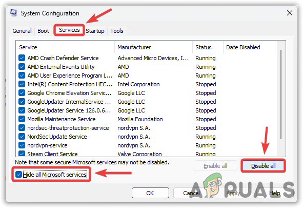 - Go to the “Services” tab and check the box that says “Hide all Microsoft services”.