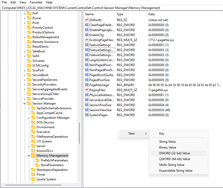HKEY_LOCAL_MACHINE\SYSTEM\CurrentControlSet\Control\Session Manager\Memory Management