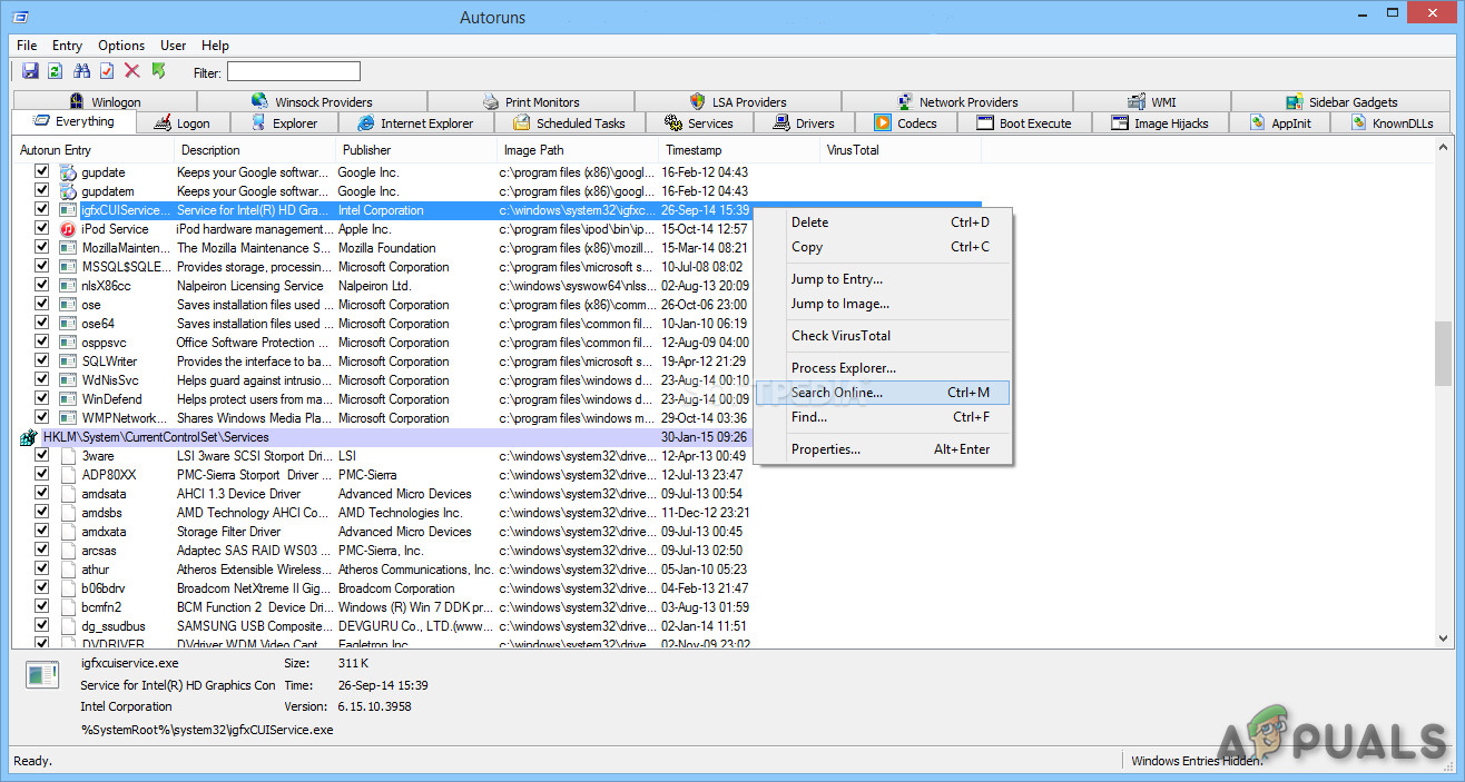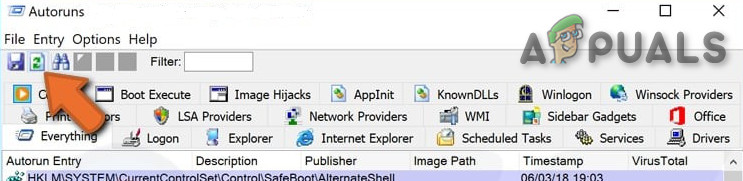 List by the Autoruns Application after Refresh - Carefully check the list provided by the Autoruns application, & locate the malicious file that has to be removed.